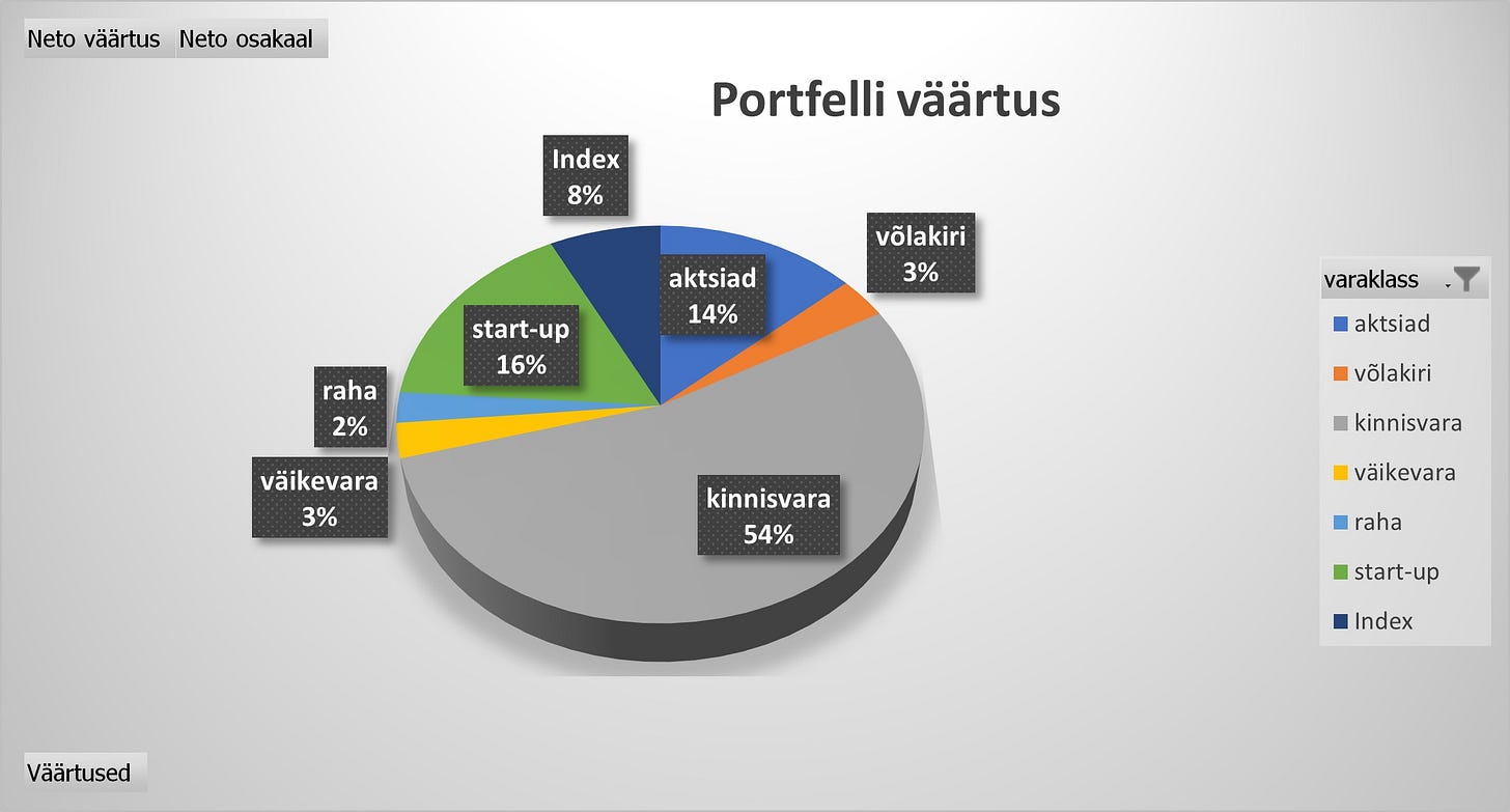 Indeksinvesteeringud on vaid pensionisambad (mõlemal nii II kui III sammas) ning näpuotsaga S&P500 Climate Net Zero ETF, aktsiaid omame nii Balti börsilt (LHV, Textmagic) kui mujalt (Microsoft, Wise, Alphabet), lisaks Inbank 12% võlakiri. Väikevarana läheb arvesse sõiduauto Ford S-Max Vignale ning seda oleme portfellis kajastanud seetõttu, et üksvahe mängisime kõvasti mõttega, et suudaksime ka ilma autota hakkama saada - keeruline oleks hiljem aru saada, kust ca 20 000 eurot lambist juurde tekkis ja nii on see portfelli jäänud. Kui kinnisvaraga seotud võimendus ka sisse arvestada, siis portfelli väärtus jääb napilt miljonile alla: 989 522 eurot.