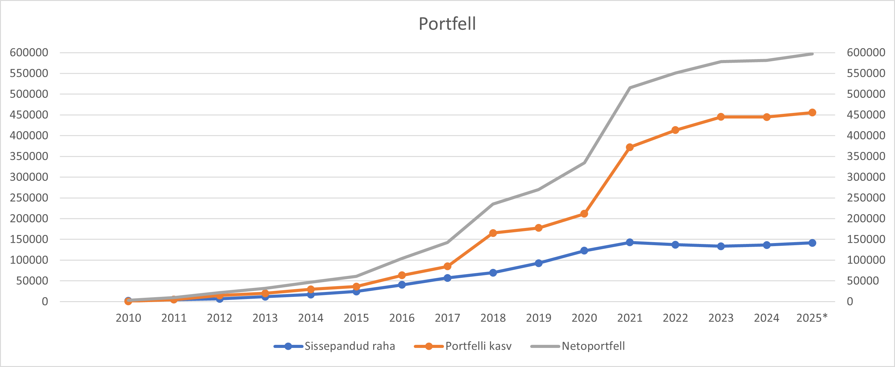 Nagu graafikult näha, hakkasime oma töö tulemeid nägema alles aastaid peale alustamist. Sinine joon näitab meie enda sisse pandud raha: alates 2021. aastast pole see joon ülespoole liikunud ning on jäänud pidama 150 000 euro juures. Oranž joon peegeldab seda, kui palju portfell ise on kasvanud. Portfelli netoväärtusele, viitab hall joon: hoolimata sellest, et viimastel aastatel oleme pigem portfellist raha välja võtnud, on see siiski väikest kasvu jätkanud. Hetkel aktiivseid sissetulekuid väga palju polegi ning see on teadlik valik.