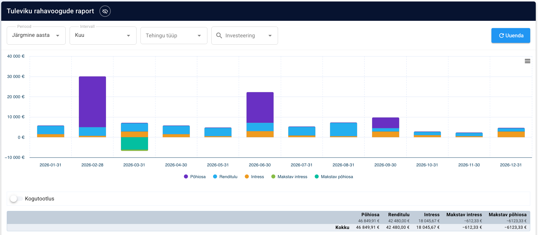 Üks vaade, mida kindlasti näha soovin on tuleviku rahavoogude prognoos - millised intressid, kupongimaksed ja dividendid on minu portfelli pealt oodata tulevikus