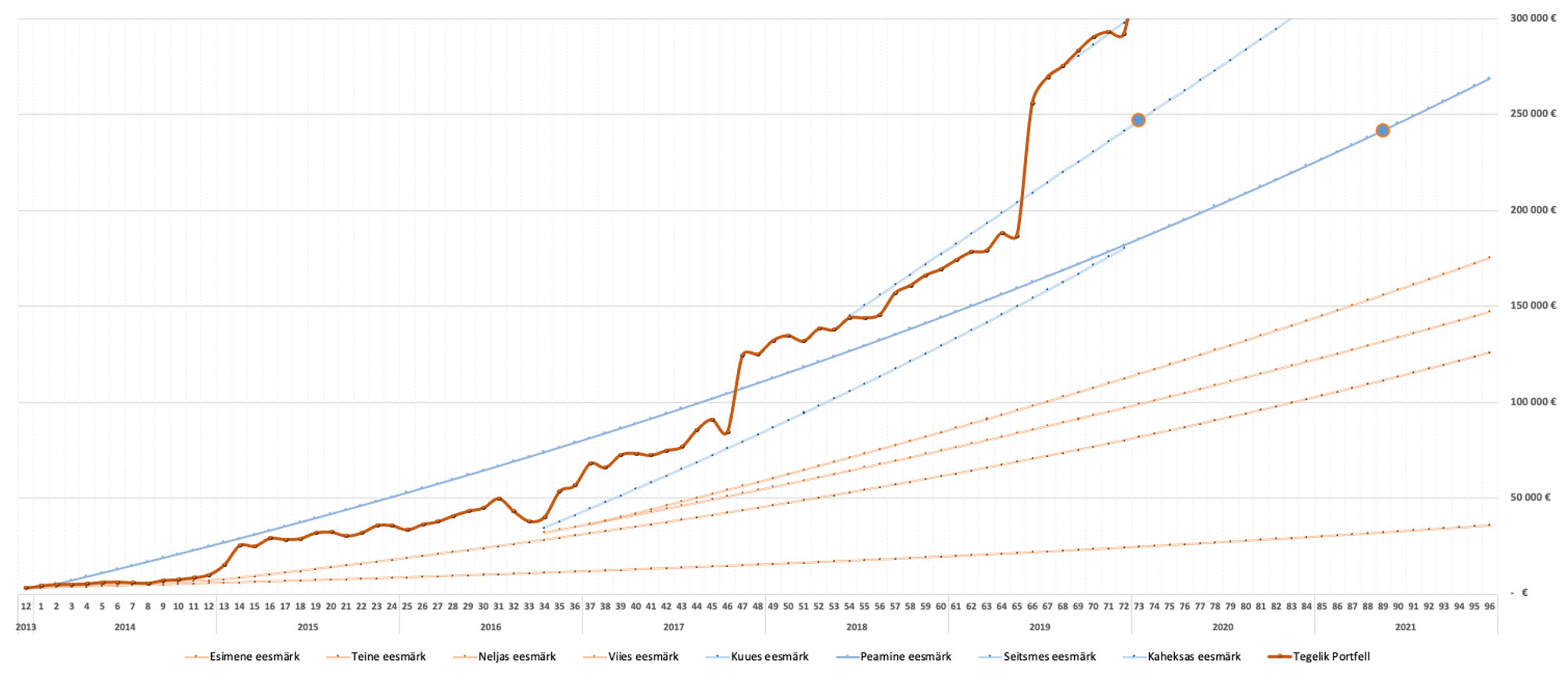 Alloleval pildil jagan teiega enda väljavõttet 2013-2020 aasta eesmärkide seadmise tabelist. Tumepunane joon tähistas minu reaalset portfelli netoväärtust ning kõik teised jooned olid erinevad eesmärgid. Kui üks eesmärk sai tugevalt ületatud siis seadsin endale uue sihi (uue joonega). Tulemuste mõõtmine ja kirja panemine süstis minusse enesekindlust, mis on olnud suureks kasuteguriks pikaajaliste tulemuste paremiseks. Mul on alati olnud väga kindel siht silmeees, kuhu soovin liikuda.