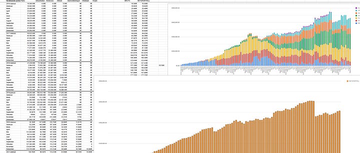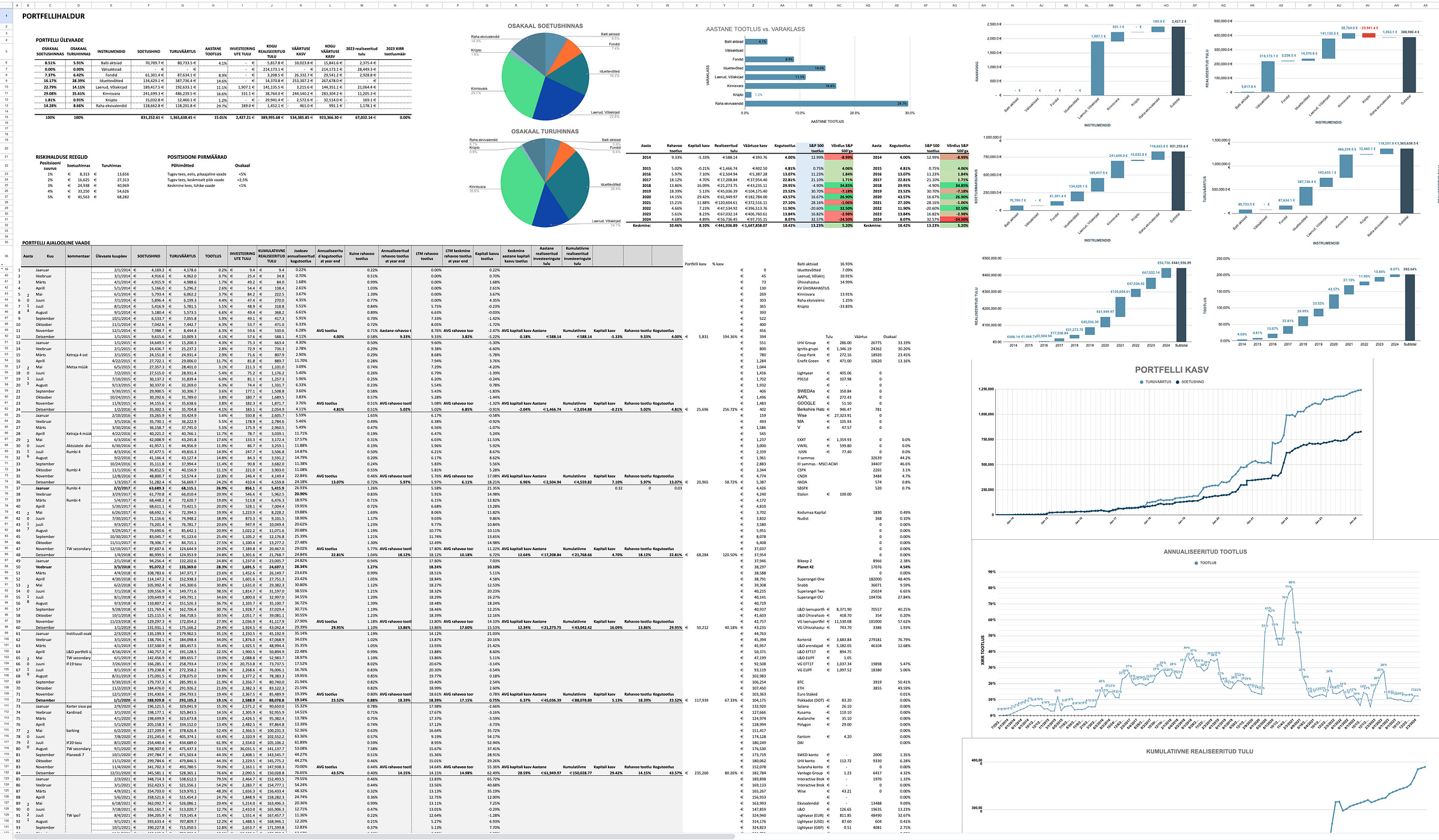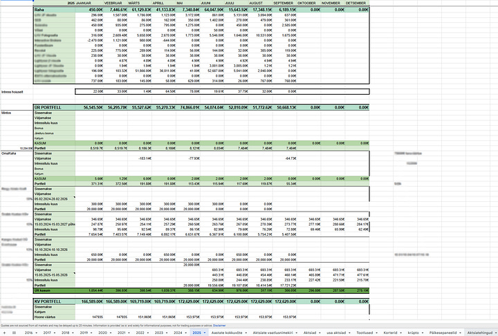 Siis kui portfell juba kuuekohaliseks sai, siis hakkasin ehitama endale personaalset google sheets faili, kus siis juba suurem maht, eraldi jälgitud nii portfelli väärtus, rahavoogude tabel ja arvutused, erinevate instrumentide XIRR arvutused, portfelliprognoosid tulevikuks jms. See fail oli kasutusel ca 8-9 aastat, sai selle aja jooksul mitu korda ümber kirjutatud ja täiendatud, sest erinevaid investeeringuid muudkui lisandus ja enda arusaam sellest, et mida ja kuidas tahaks näha ka arenes (nt sai juurde ehitatud igasuguseid visuaalseid graafikuid).