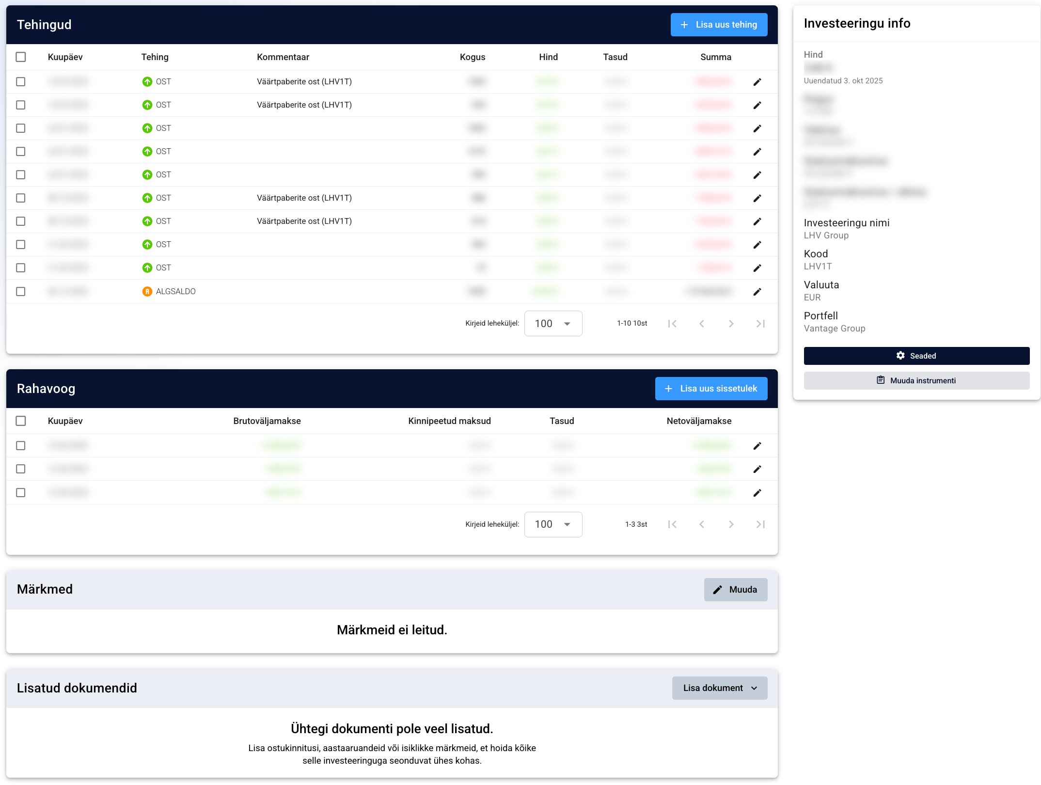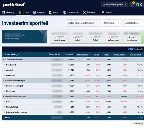 Portfellow abil saan täna vaadata enda investeeringuid erinevas detailsusastmes. Varaklasside, kategooriate ja üksik positsioonide kaupa. Saan kätte vajaliku ülevaate koos osakaalude, soetushindade, turuhindade, tootluste ja rahavoogudega.