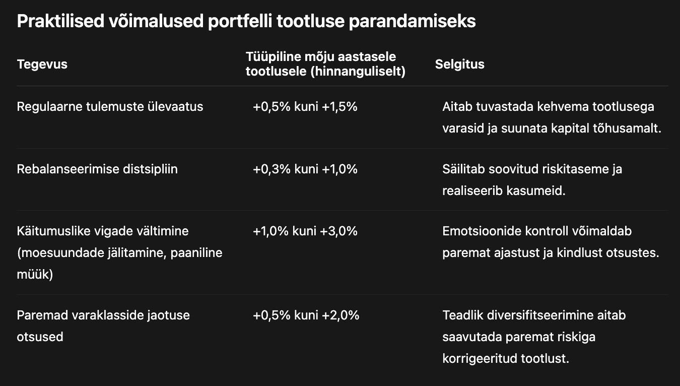 Mitmed sõltumatud uurimistööd, sealhulgas Vanguard’i “Advisor’s Alpha” ja teiste rahvusvaheliste varahaldurite analüüsid, on näidanud, et struktureeritud portfellihaldus võib tuua investoritele märkimisväärset lisatootlust. Allolev tabel toob välja võtmetegurid, mis aitavad portfelli pikaajalist tootlust tõsta 1% kuni 4%+ aastas.